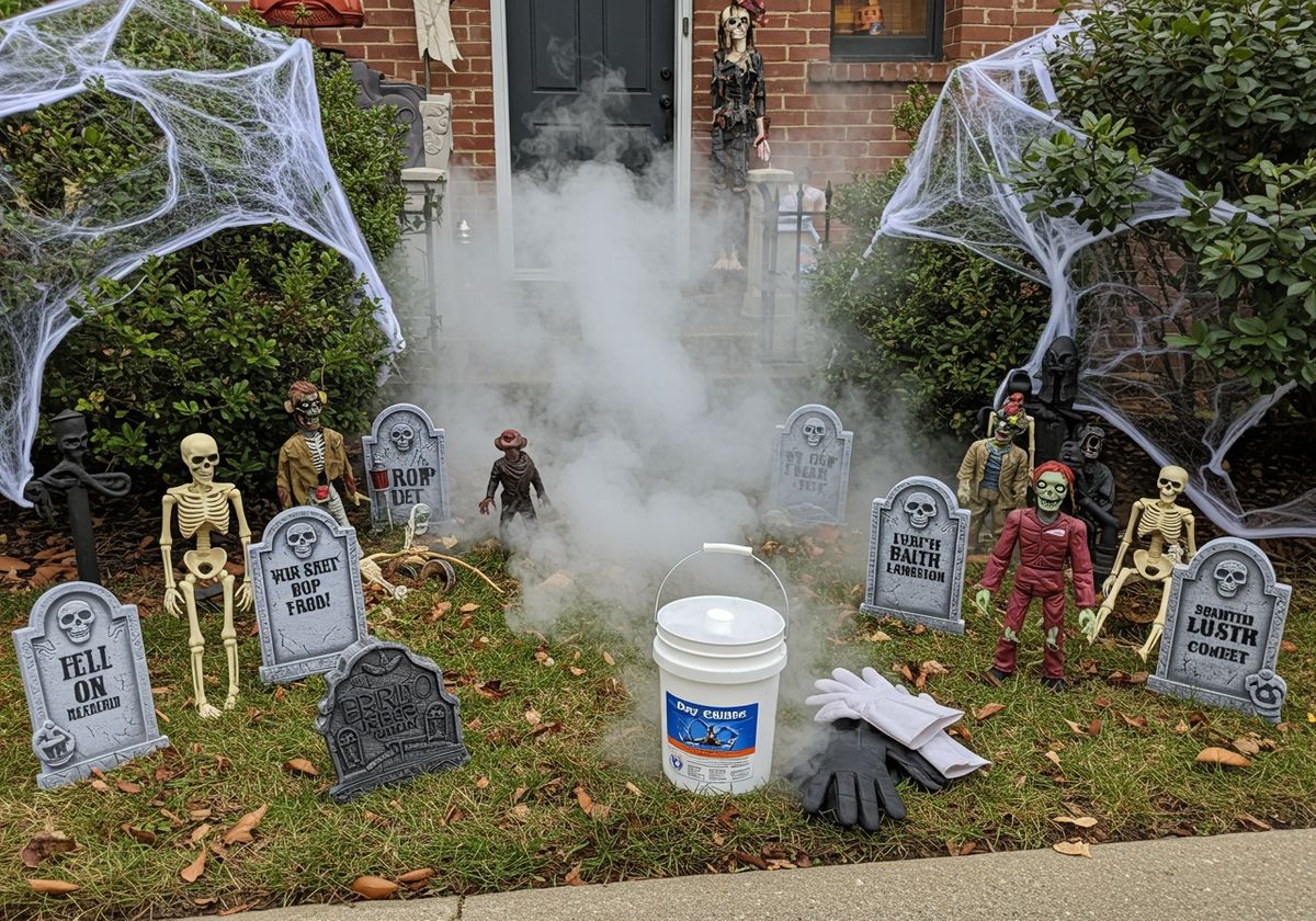 Create your own mini graveyard in your front yard. Use foam tombstones with humorous or spooky epitaphs. Drape faux cobwebs over shrubs and trees, and add skeletons or zombie figures for an extra touch of fright. You can even create a DIY fog chiller using dry ice and a bucket to add a layer of ground fog to your graveyard scene. Remember when using dry ice to wear protective gloves and eyewear, and never place it directly on skin or other surfaces.