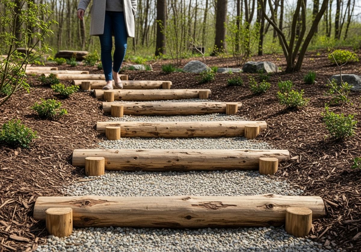 Create charming and natural pathways by arranging logs horizontally or vertically across your yard. For a more stable surface, consider embedding the logs slightly into the ground. You can fill the spaces between the logs with gravel, mulch, or even grass to enhance the pathway's visual appeal and functionality. This option is particularly suitable for woodland gardens or areas with a natural, rustic theme.